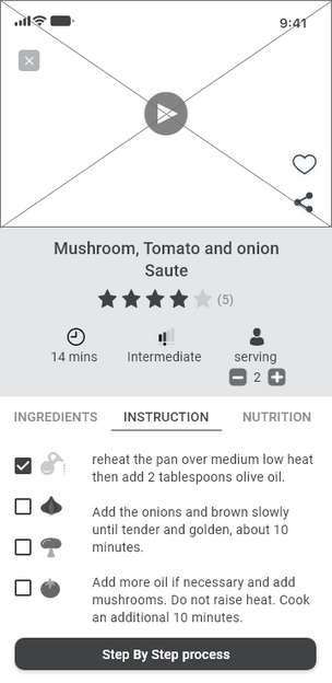 In this part, the user can see which groceries are included in the recipe and which of them they have at home. If the user doesn’t have all of the groceries, they can add what is missing to a shopping list for future use